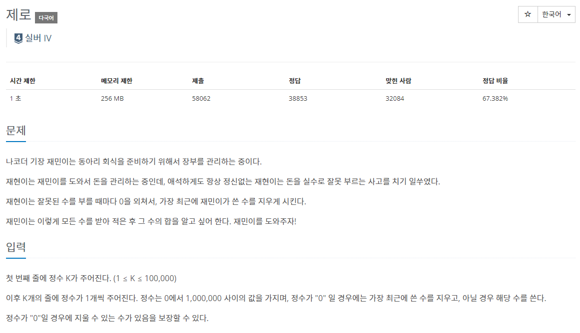 입력되는 숫자를 차곡차곡 스택에 넣다가 0이 입력되면 스택에서 하나를 빼는 방식으로