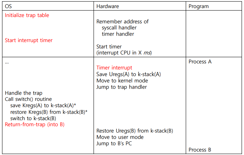 먼저 OS는 trap에 대한 내용이 들어있는 trap table를 초기화하고 하드웨어는 syscall handler 의 주소와 timer handler를 기억한다. 또, OS 는 interrupt timer을 시작하고 하드웨어에서 시작된다.