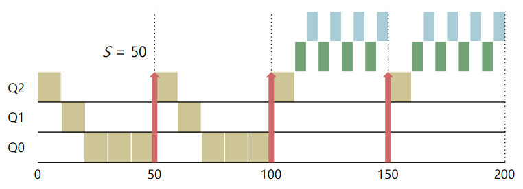 - I/O를 위해 CPU를 반복적으로 포기하는 job은 우선순위를 높게 유지해준다